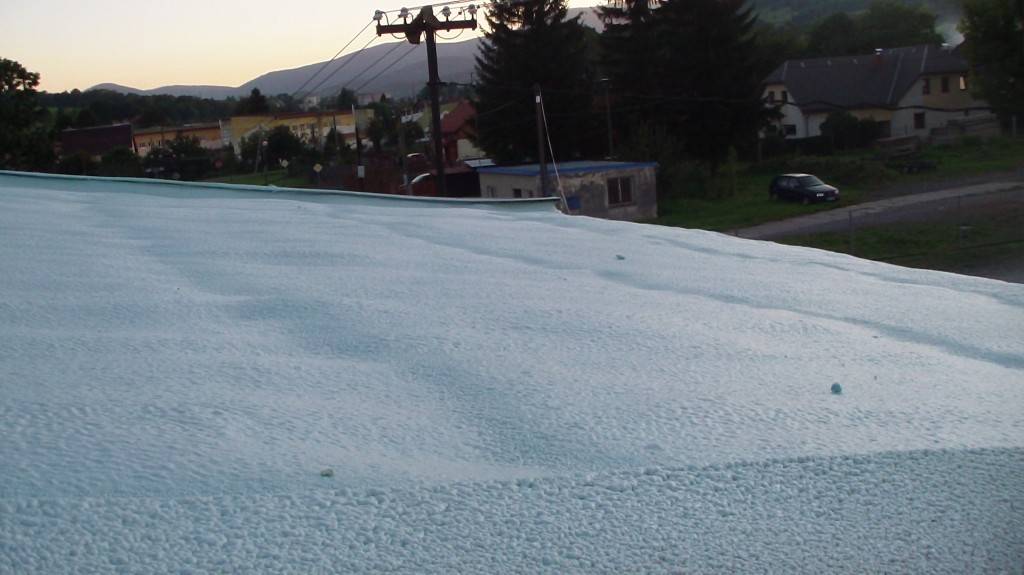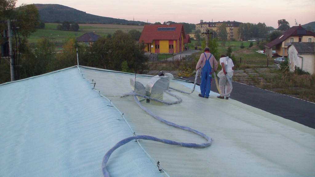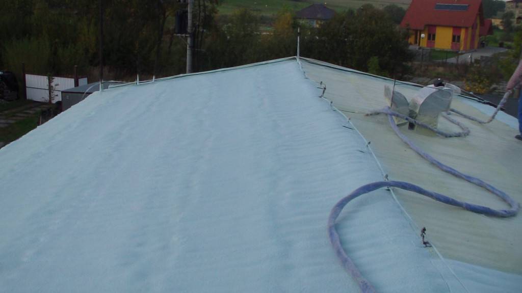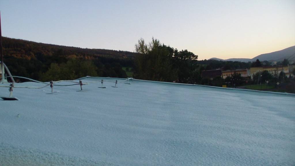 Hydroizolace ploché střechy Tepelná izolace a hydroizolace ploché střechy průmyslové haly , včetně ochranného UV nástřiku. Fotografie