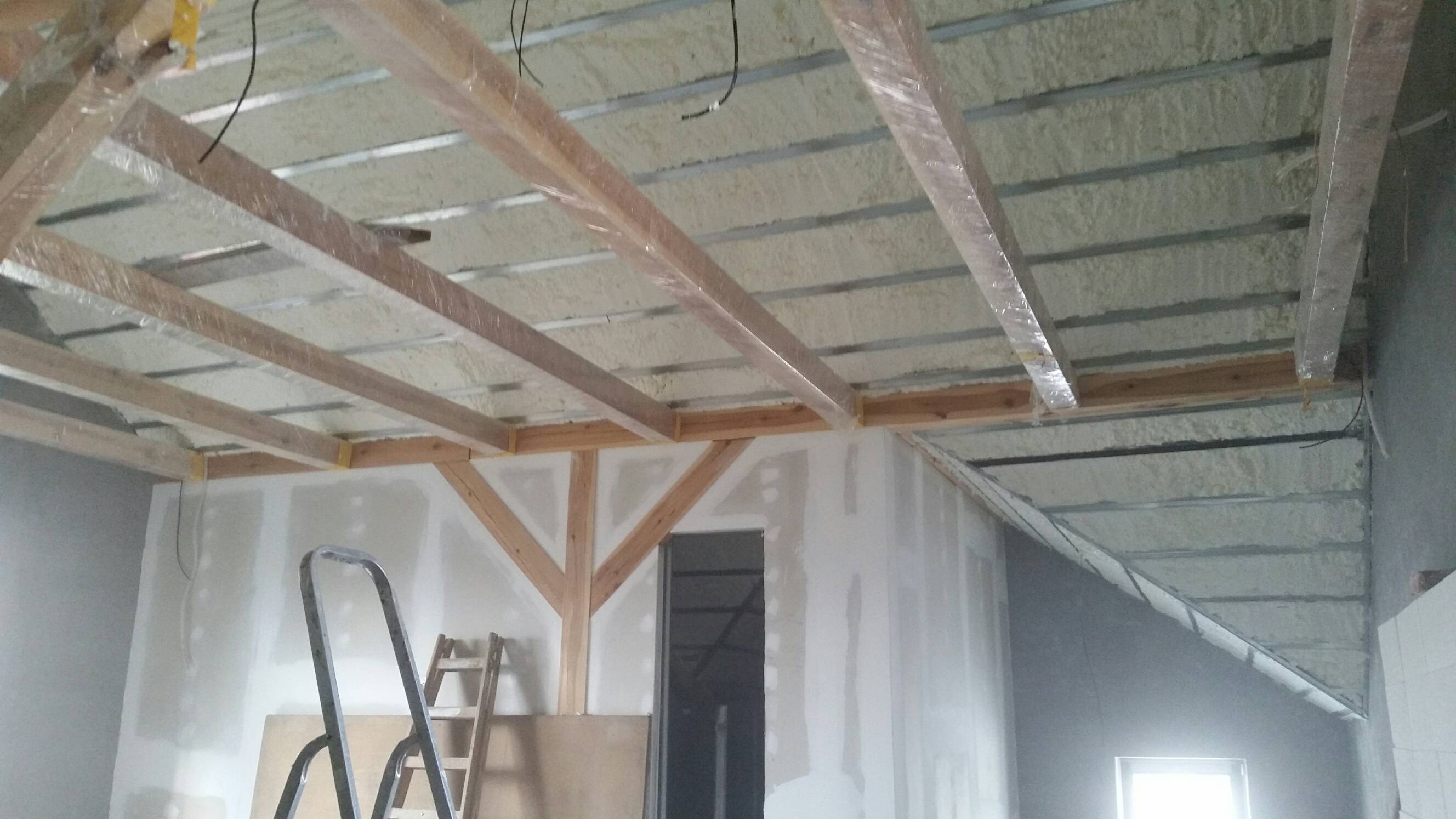 Zateplení podkroví v Česká Lípa Předmětem zateplení byla střecha v podkrovní části domu v České Lípě. Do předem připravených SDK roštů byla aplikována tvrdá pěna v síle nástřiku 4cm a měkká pěna v síle nástřiku 13cm. Následně byla izolace ořezána a zaklopena sádrokartonem.