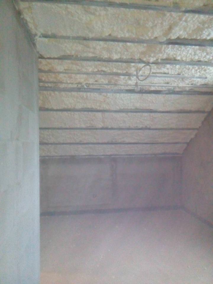 Zateplení střechy v podkrovní části domu v Návsí. Izolace byla aplikována do předem připravených SDK roštu, s jejich následným začištěním a ořezem pěnové izolace.